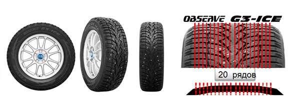 Toyo OBSERVE G3-ICE - шипованная зимняя шина сезона 2013-2014 для легковых автомобилей. При изготовлении OBSERVE G3-ICE была использована новая технология шипования в сочетании с запатентованной уникальной технологией компании Toyo "Microbit" (частицы скорлупы грецкого ореха в составе резиновой смеси протектора). Данную технологию компания Toyo использует при изготовлении нешипованных шин. В результате сочетания традиционных шипов и натуральных микрошипов "Microbit" шина OBSERVE G3-ICE обеспечивает высокие характеристики сцепления и торможения в самых суровых зимних условиях.